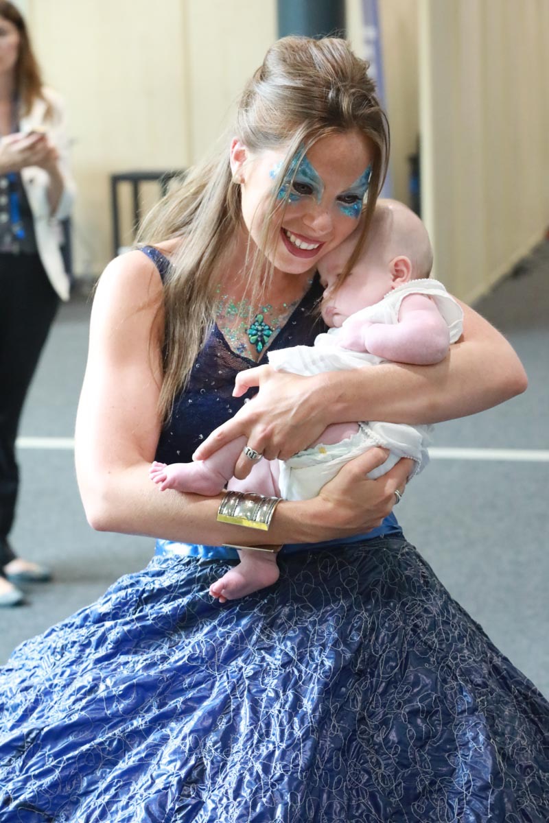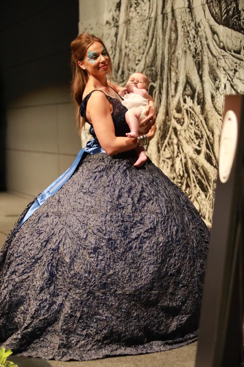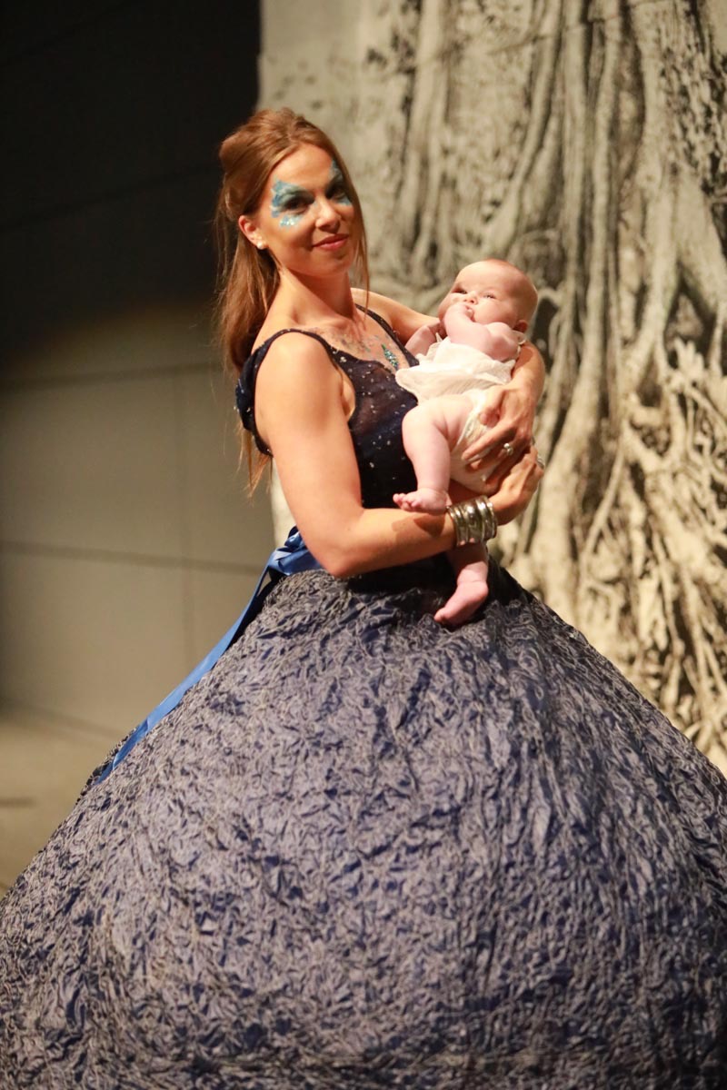 - Claire Caramelle et son bébé Agathe présentent la robe Voie Lactée réalisée en parachute recyclé (don de voile de la Fédération Française de Parachutisme) maille et pierres