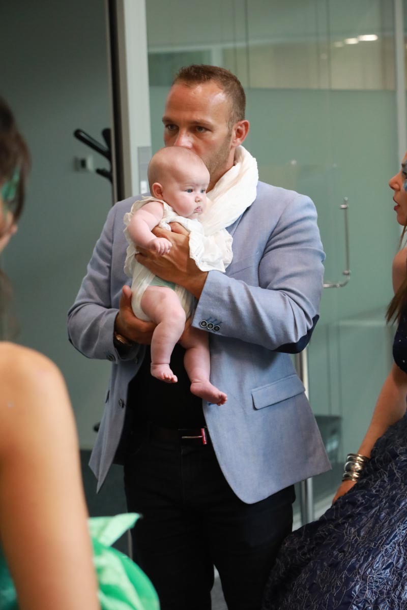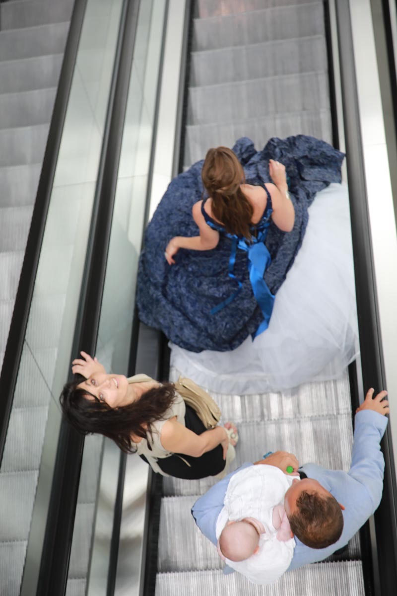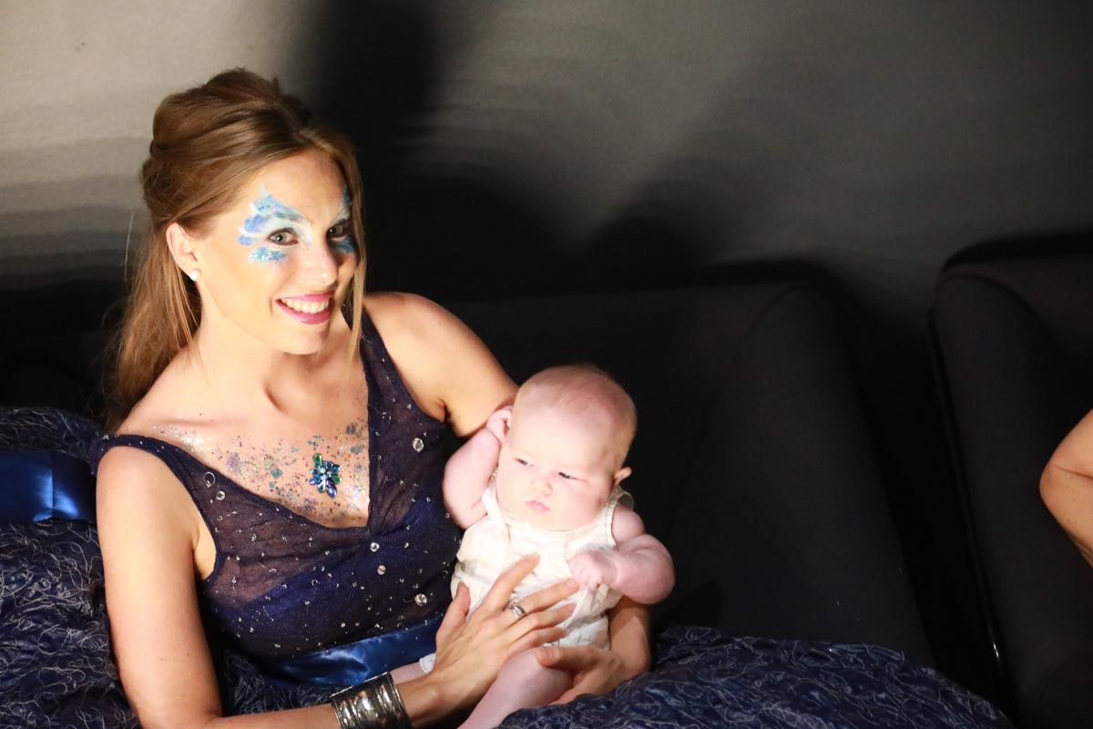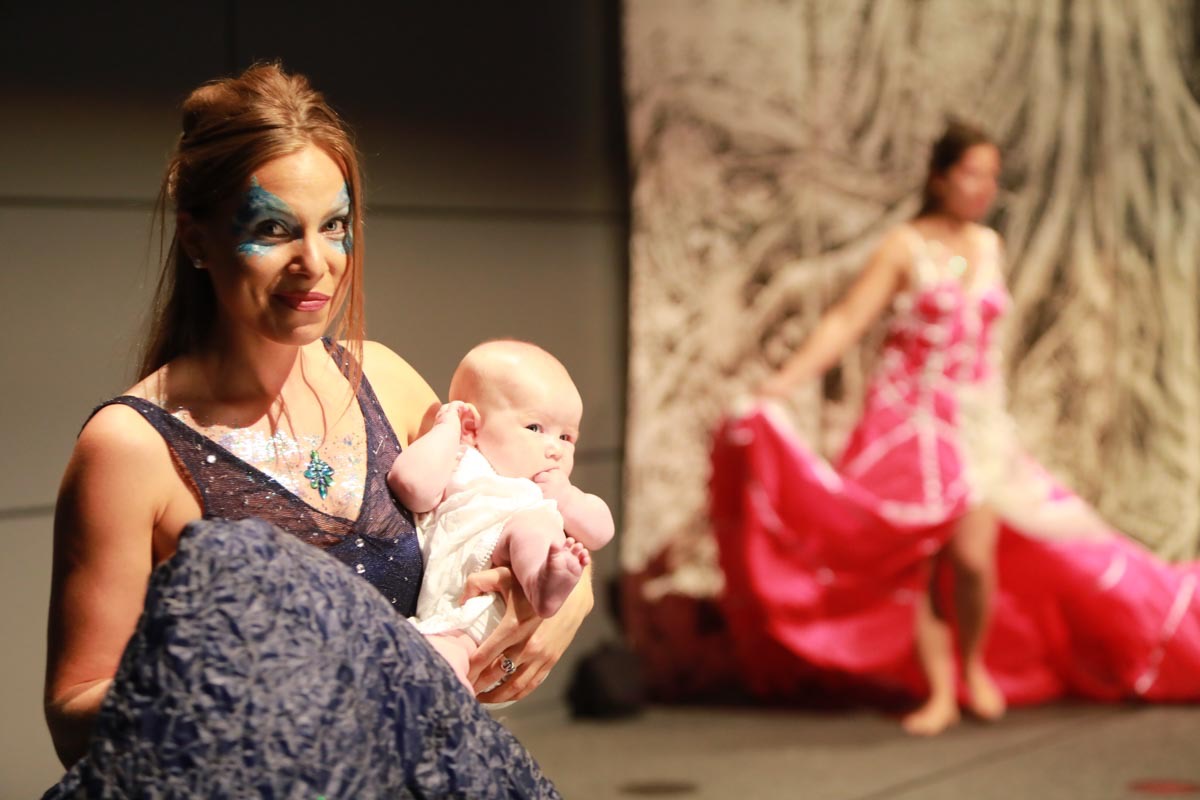 - Claire Caramelle et son bébé Agathe présentent la robe Voie Lactée réalisée en parachute recyclé (don de voile de la Fédération Française de Parachutisme) maille et pierres