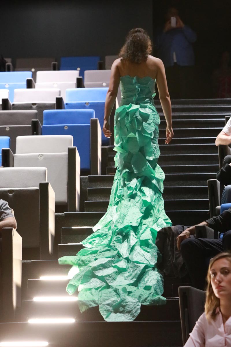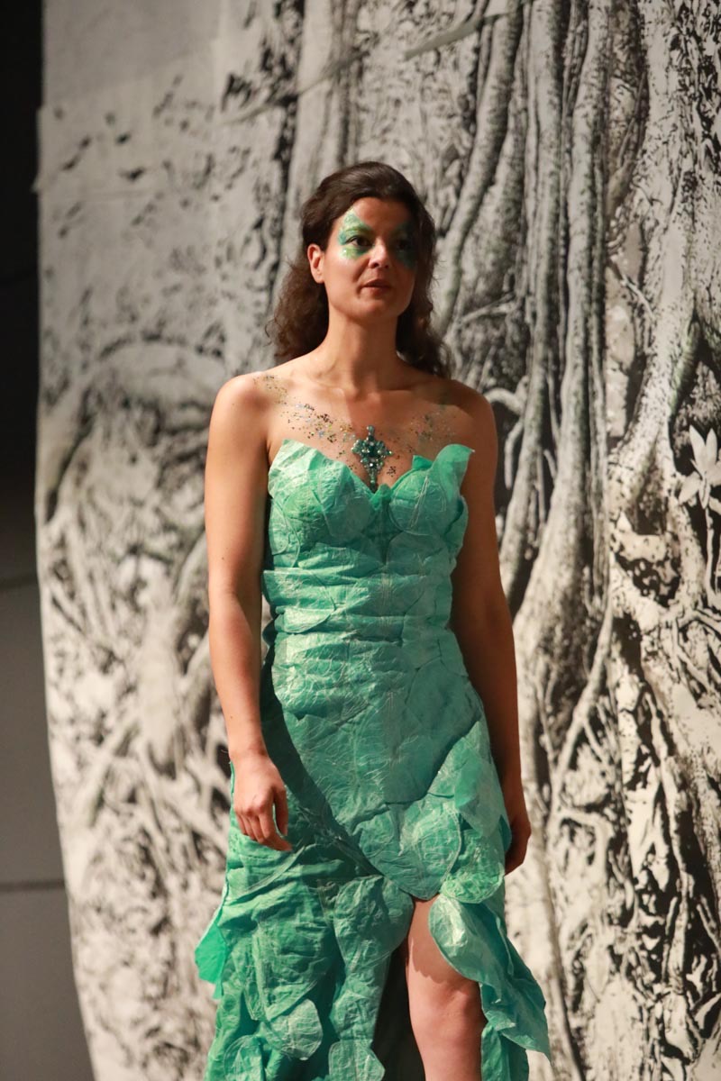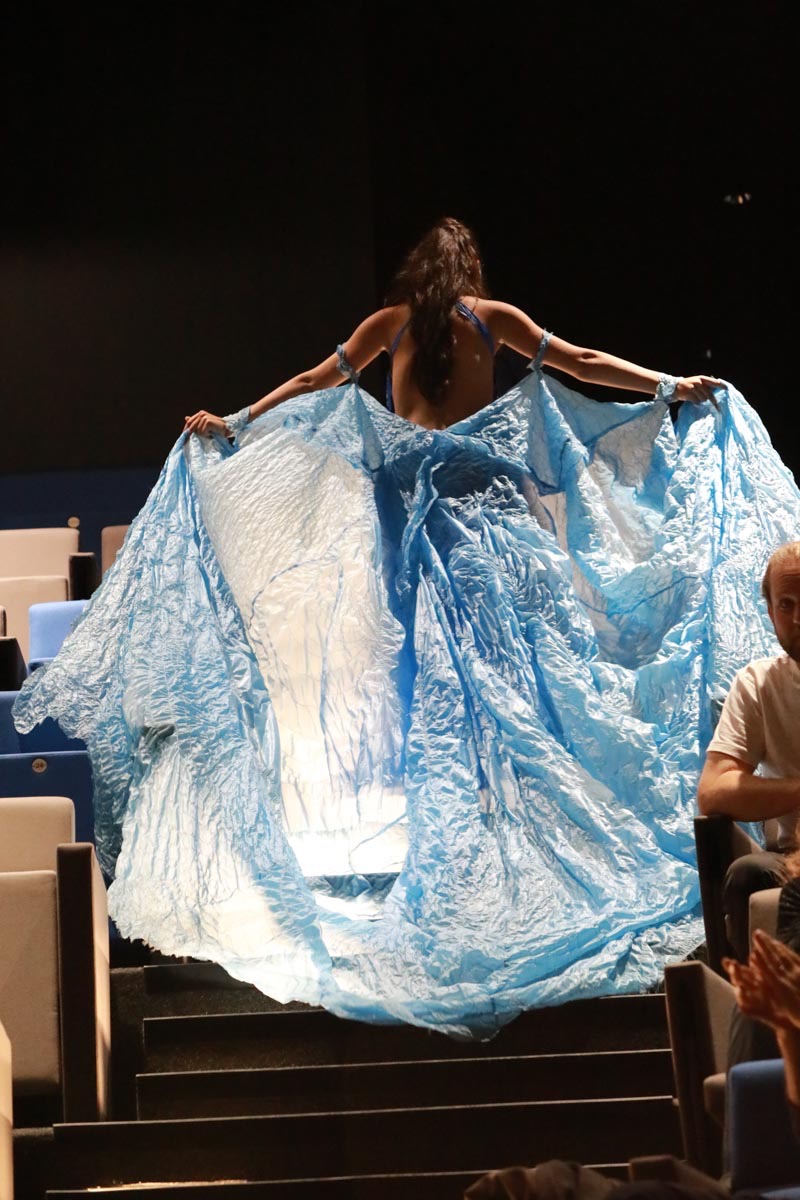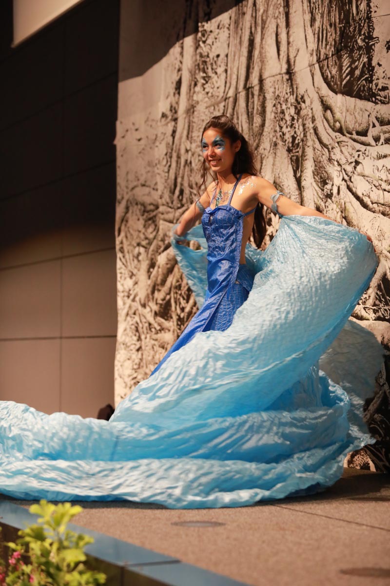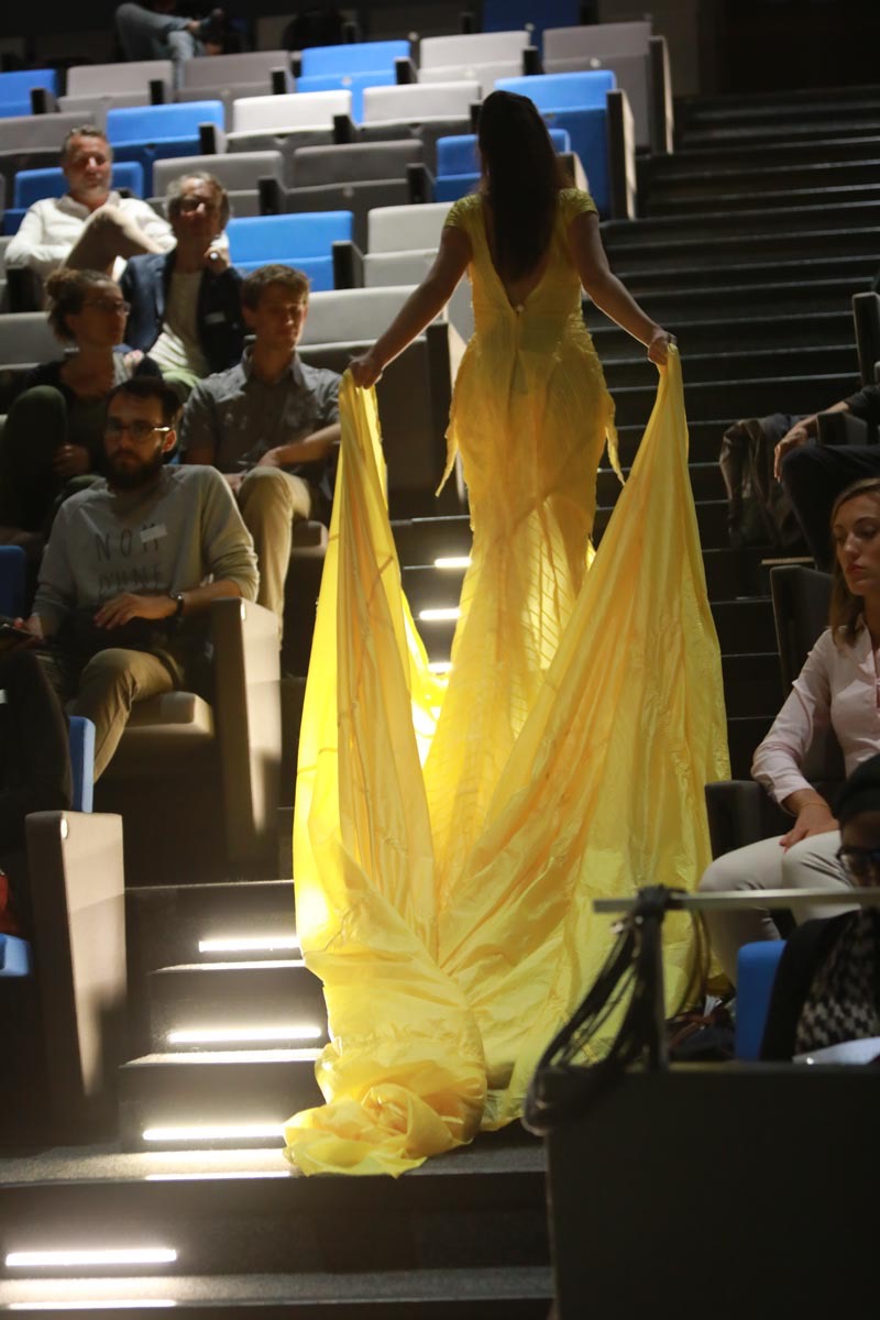 - Tess Roux Pache présente la robe Papillon crée en hommage au peuple Surui , elle est réalisée en parachute recyclé (don de voile de la Fédération Française de Parachutisme )