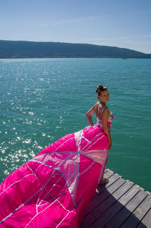 Créations réalisées en parachute recyclé (parachute de survie)– Robe de l’Air– Robe Ballerine– Robe Cygne– Robe Tutu– Robe parachute rose – Robe petit chaperon Bleu [Voir le diaporama]