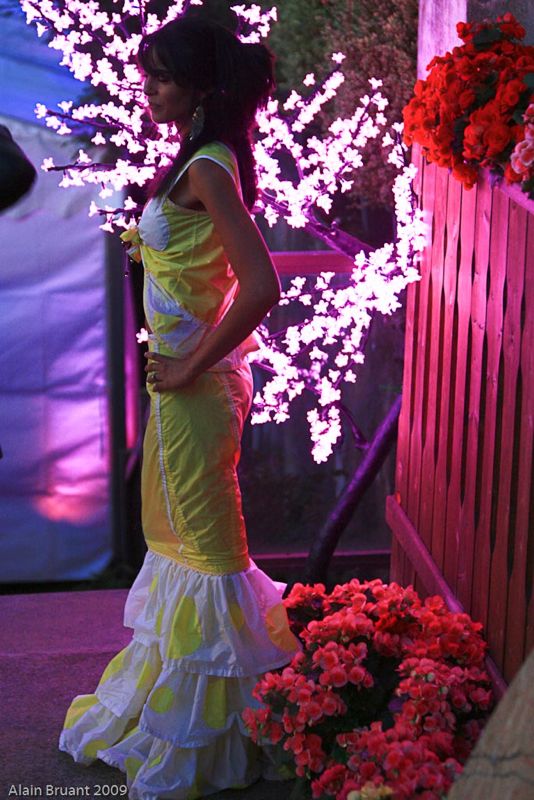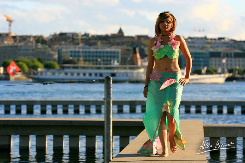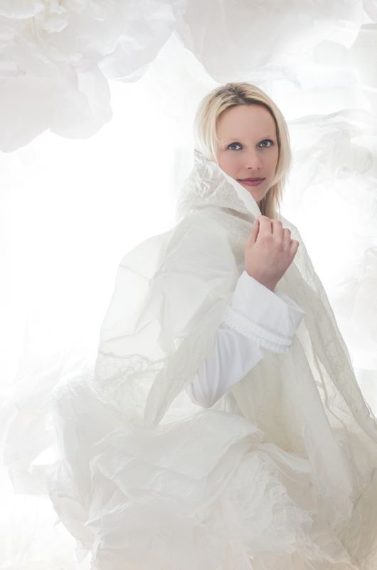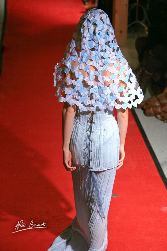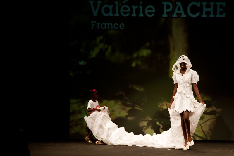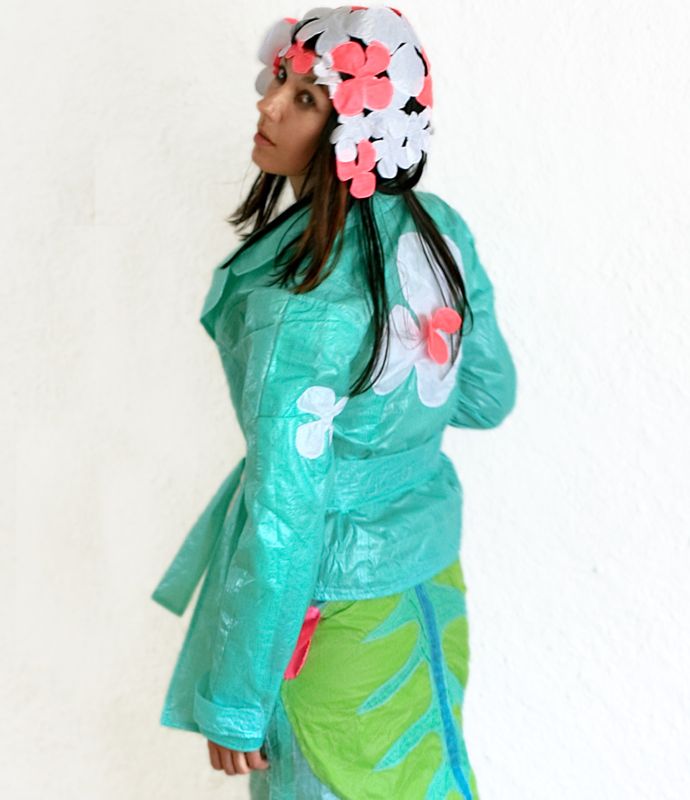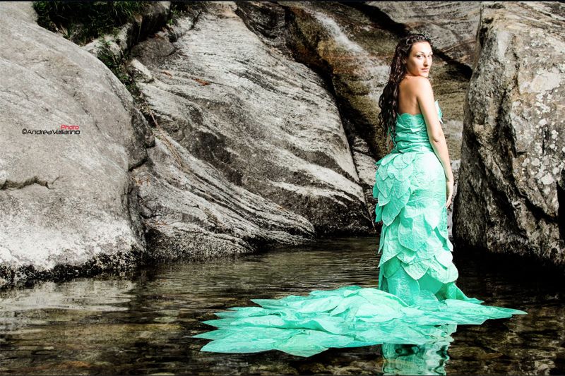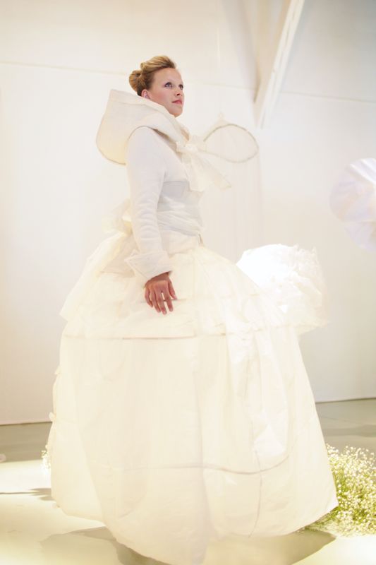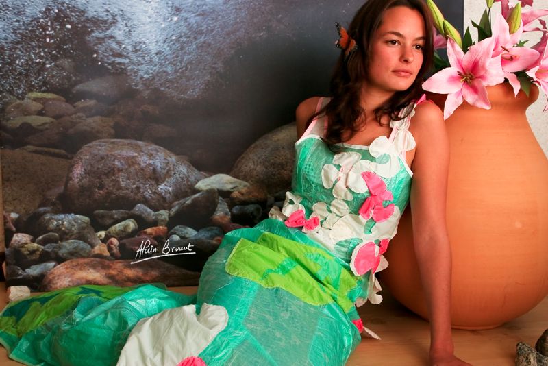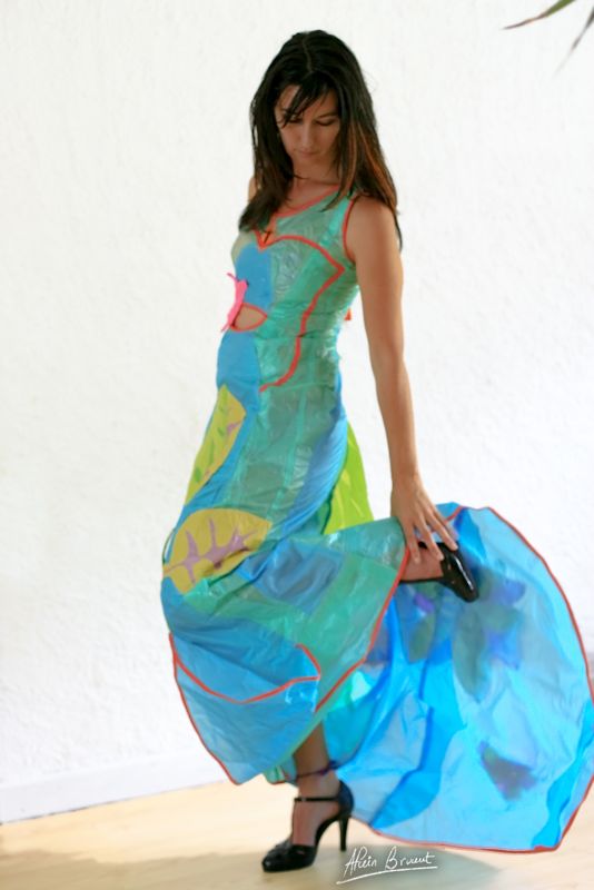 Je vais en premier lieu créer des « robes d’eau », la matière issue de l’air se transforme en eau… Je décide par la suite de les articuler en assemblant des pièces, des ronds, des fleurs, puis d’associer ces pièces (ronds, fleurs, gouttes,coeurs) avec des matières naturelles, bio ou vintage.